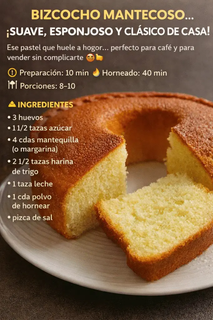 Hay recetas que nunca pasan de moda… y este bizcocho mantecoso es una de ellas. Con su textura suave, esponjosa y ese aroma irresistible que llena la cocina, es perfecto para acompañar un café, compartir en familia o incluso comenzar un pequeño negocio desde casa.