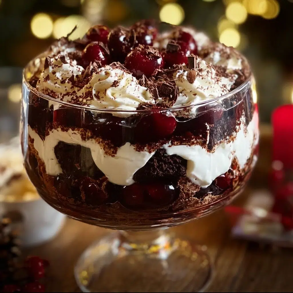 Serve the Black Forest Trifle chilled. You can garnish each serving with extra whipped cream, dark chocolate shavings, or a sprinkle of cocoa powder to make it even more festive. It makes a beautiful centerpiece for your holiday table.