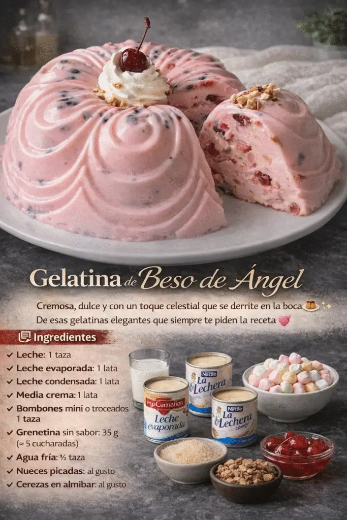 La gelatina beso de ángel es uno de esos postres que conquistan con solo verlos. Es cremosa, tiene textura de nube por los bombones derretidos y un dulzor equilibrado gracias a la mezcla de leches. Además, es muy versátil: podés decorarla con nueces, cerezas, frutos rojos o dejarla así, pura, para que brille sola.