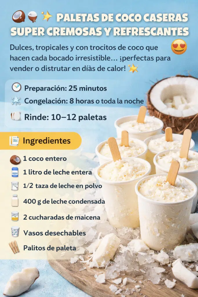 Cuando el calor aprieta, no hay nada mejor que un postre frío, dulce y lleno de sabor tropical. Estas paletas de coco caseras son una auténtica delicia: cremosas, suaves y con pequeños trocitos de coco que las hacen irresistibles. Además, son perfectas tanto para disfrutar en casa como para emprender y vender en verano. ¡Vamos a prepararlas juntos!