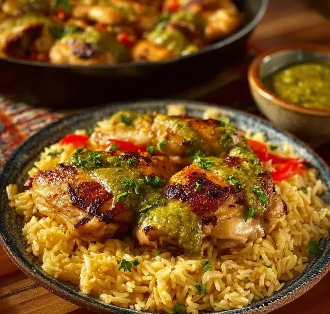 A comforting one-pot meal combining juicy chicken, fluffy rice, and a fresh cilantro lime sauce.