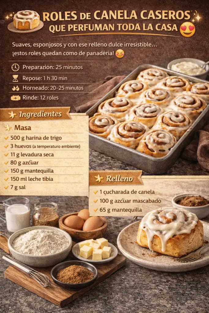 Hay aromas que abrazan el alma, y el de los roles de canela recién horneados es uno de ellos. Suaves, esponjosos y con ese relleno dulce y especiado que se derrite en cada bocado… esta receta es perfecta para disfrutar en familia o sorprender con un toque de panadería artesanal en casa.