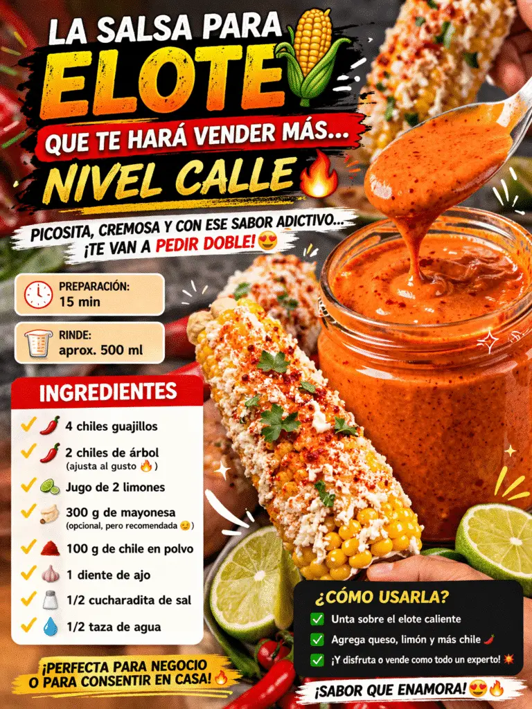 Si alguna vez probaste un elote de puesto callejero y pensaste “¿qué tiene esta salsa que es tan adictiva?”, hoy te traigo la respuesta. Esta salsa cremosa, picosita y llena de sabor es perfecta para llevar tus elotes al siguiente nivel… ¡o incluso para empezar a vender y conquistar clientes!